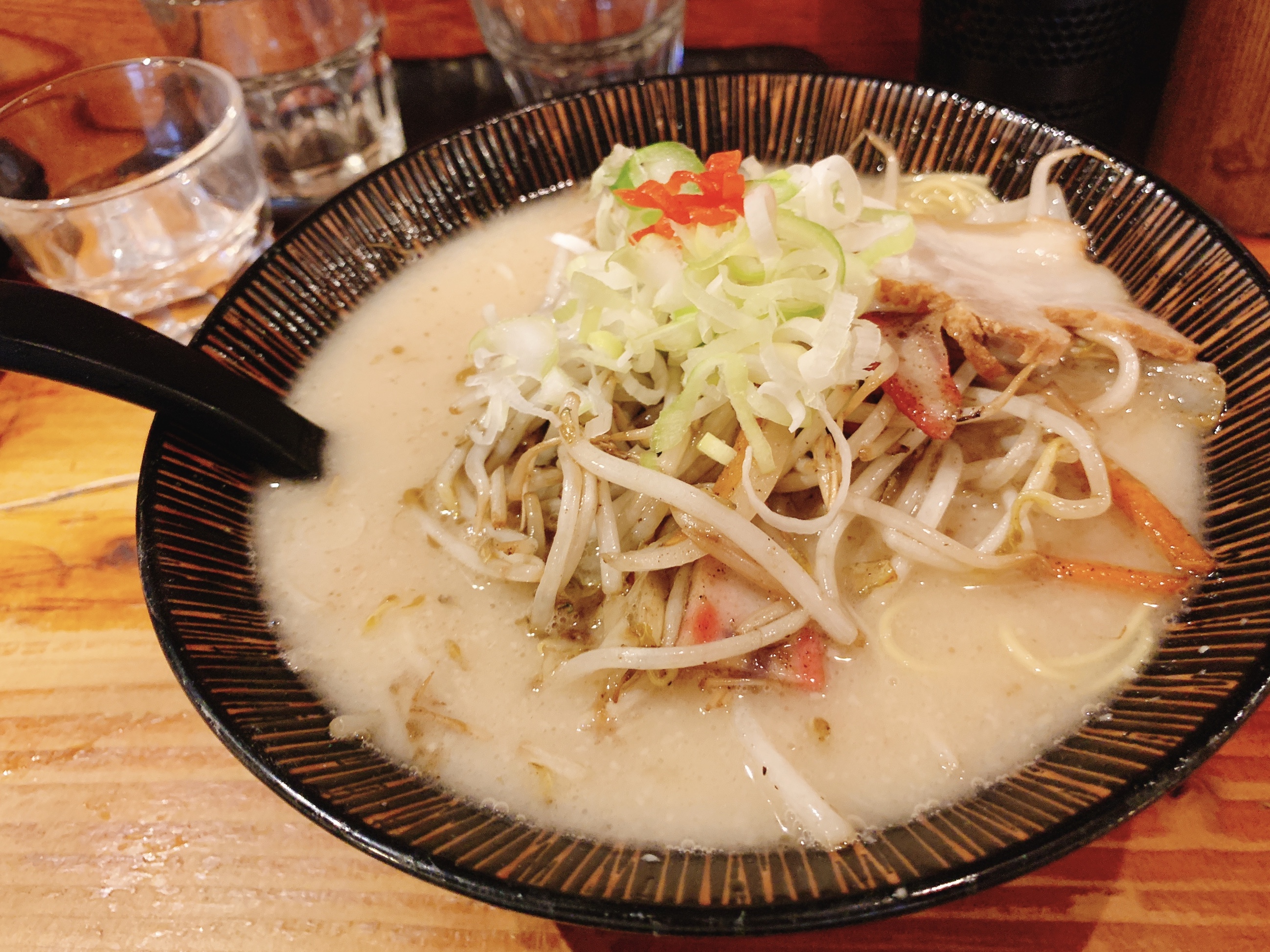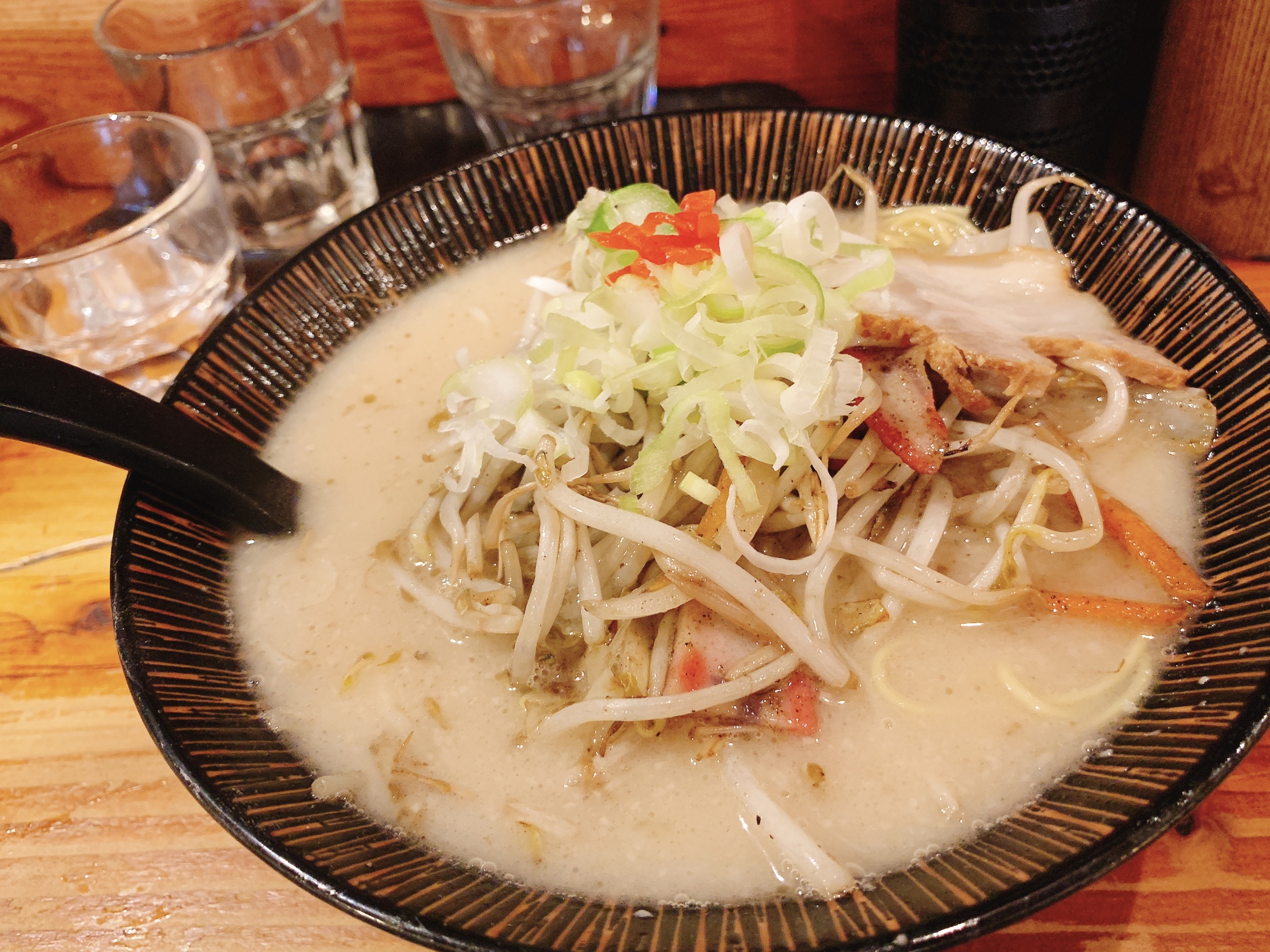 양배추, 양파, 당근, 매화 어묵, 숙주를 센 불에 단시간 볶아 라멘 위에 얹은 화끈한 맛과