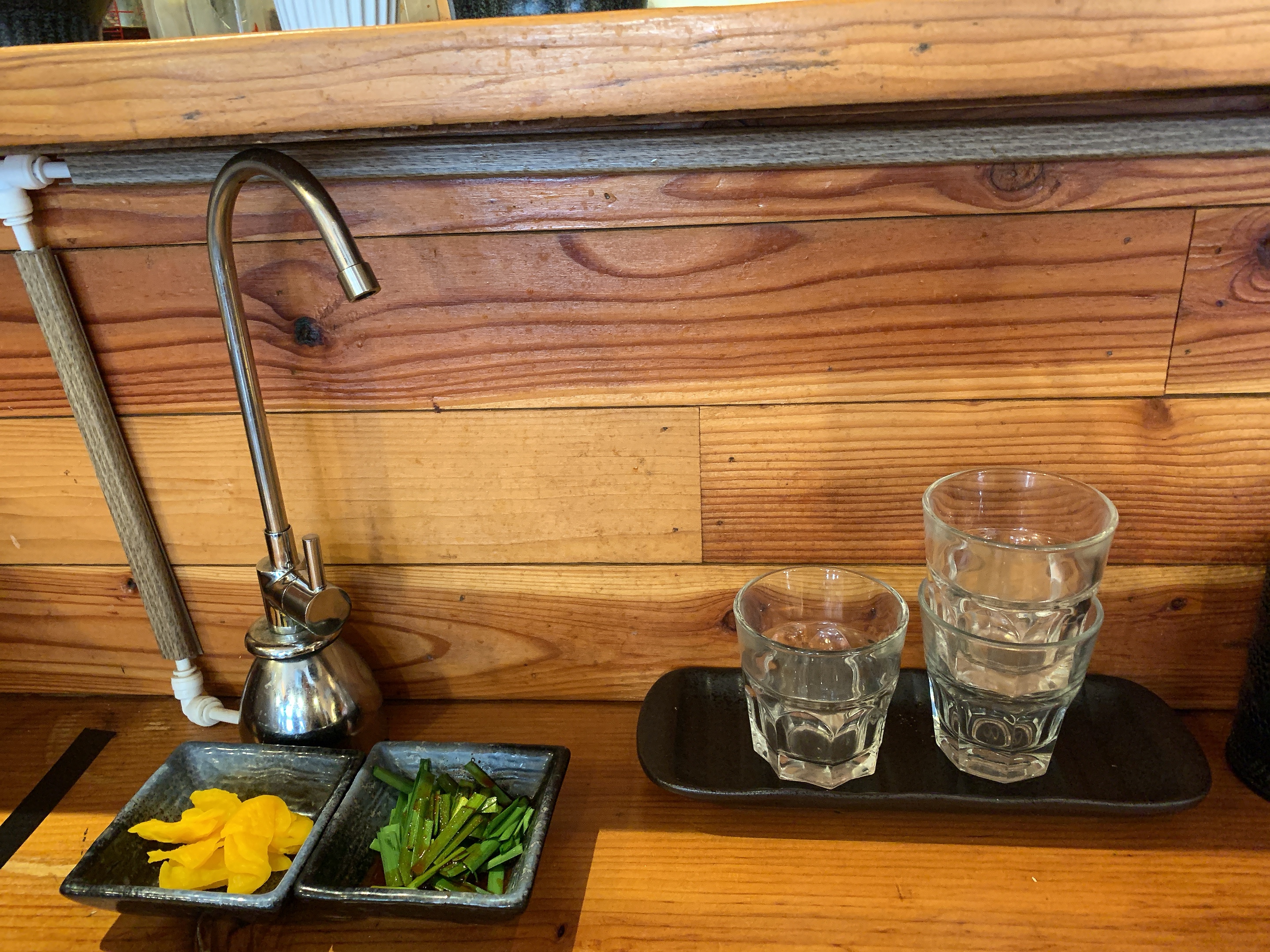 기본반찬으로 단무지와 부추가 나오고 부족하면 바테이블 한쪽 구석에 있는 반찬통에서 리필해 먹을 수 있다.