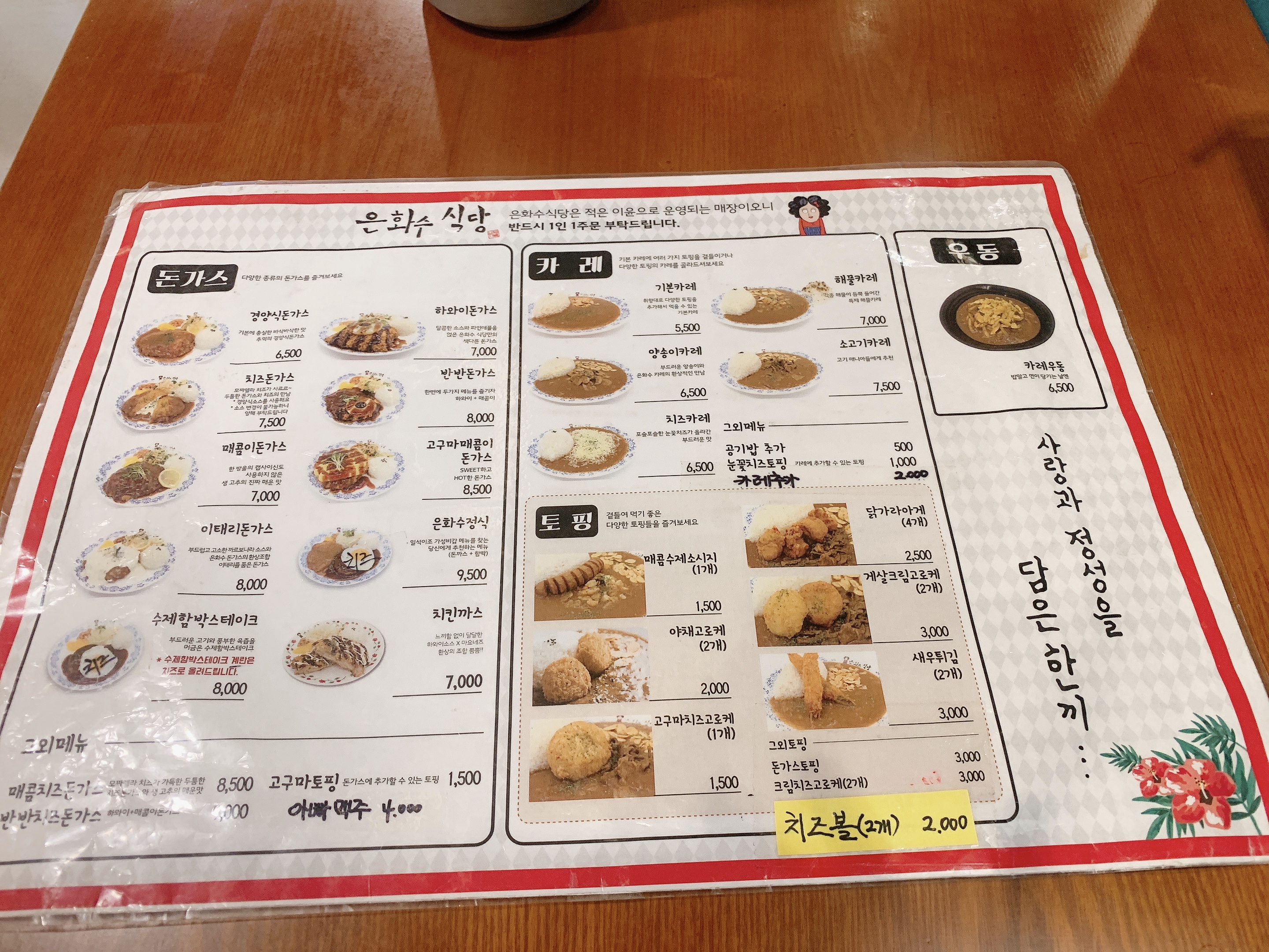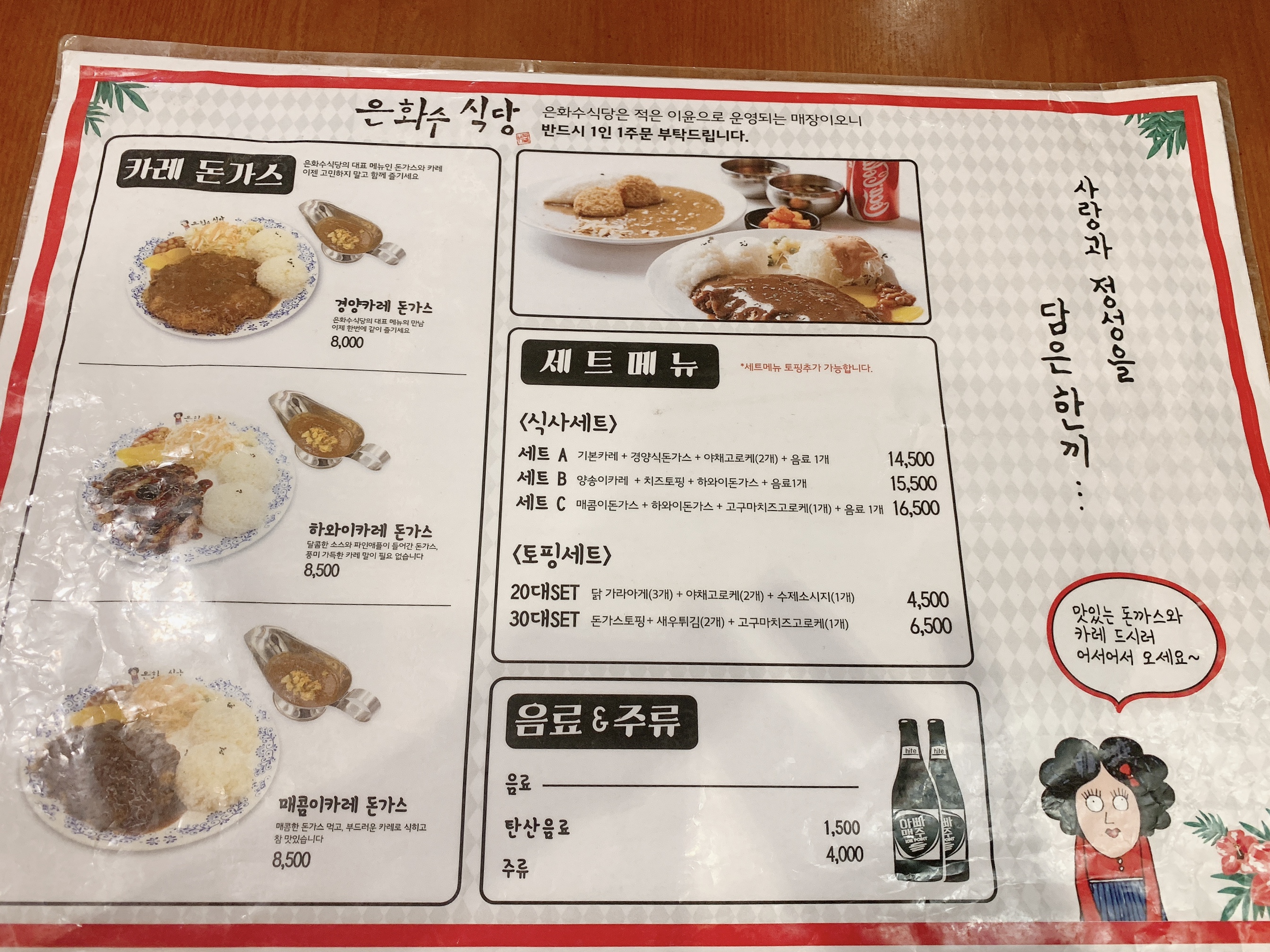 메뉴는 돈가스(돈까스)와 카레가 메인이고, 토핑을 추가할 수 있다.
