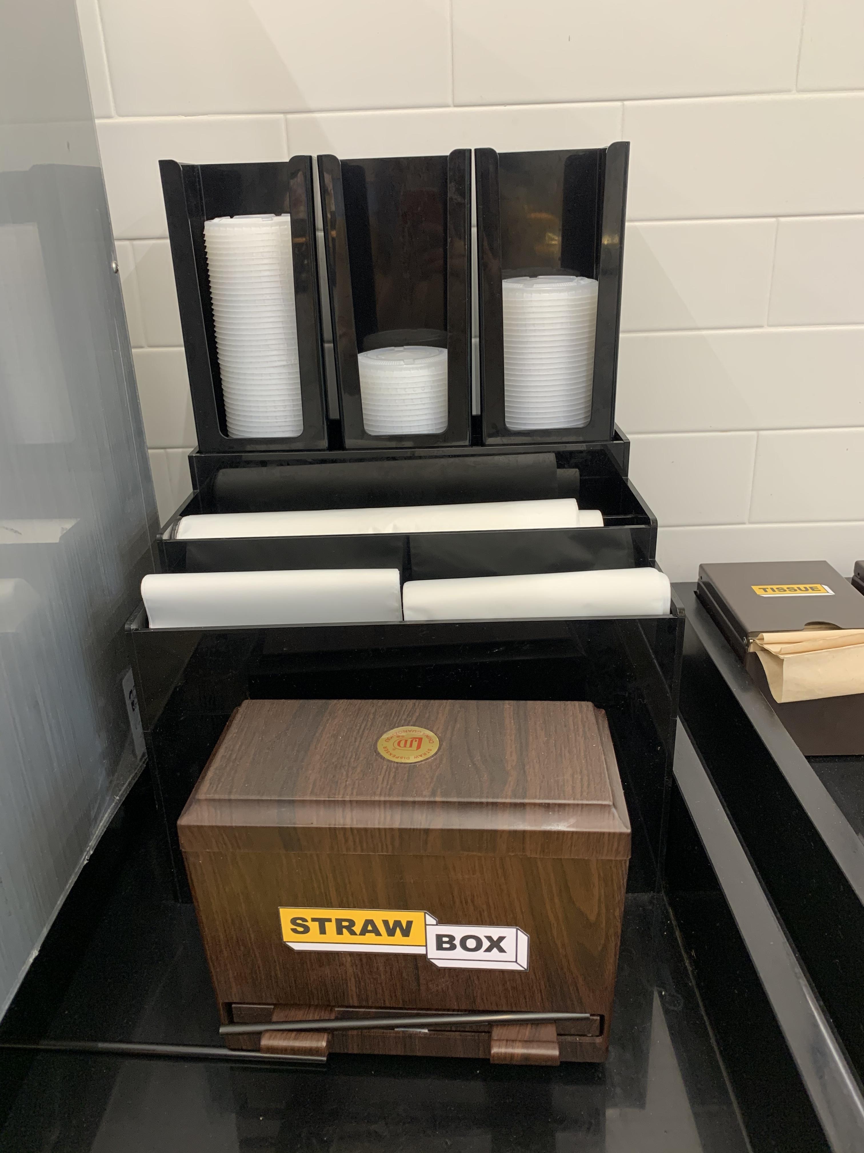 음료 옆에는 뚜껑, 냅킨, 빨대가 있어서 테이크아웃 고객도 직접 본인이 포장해가면 된다.