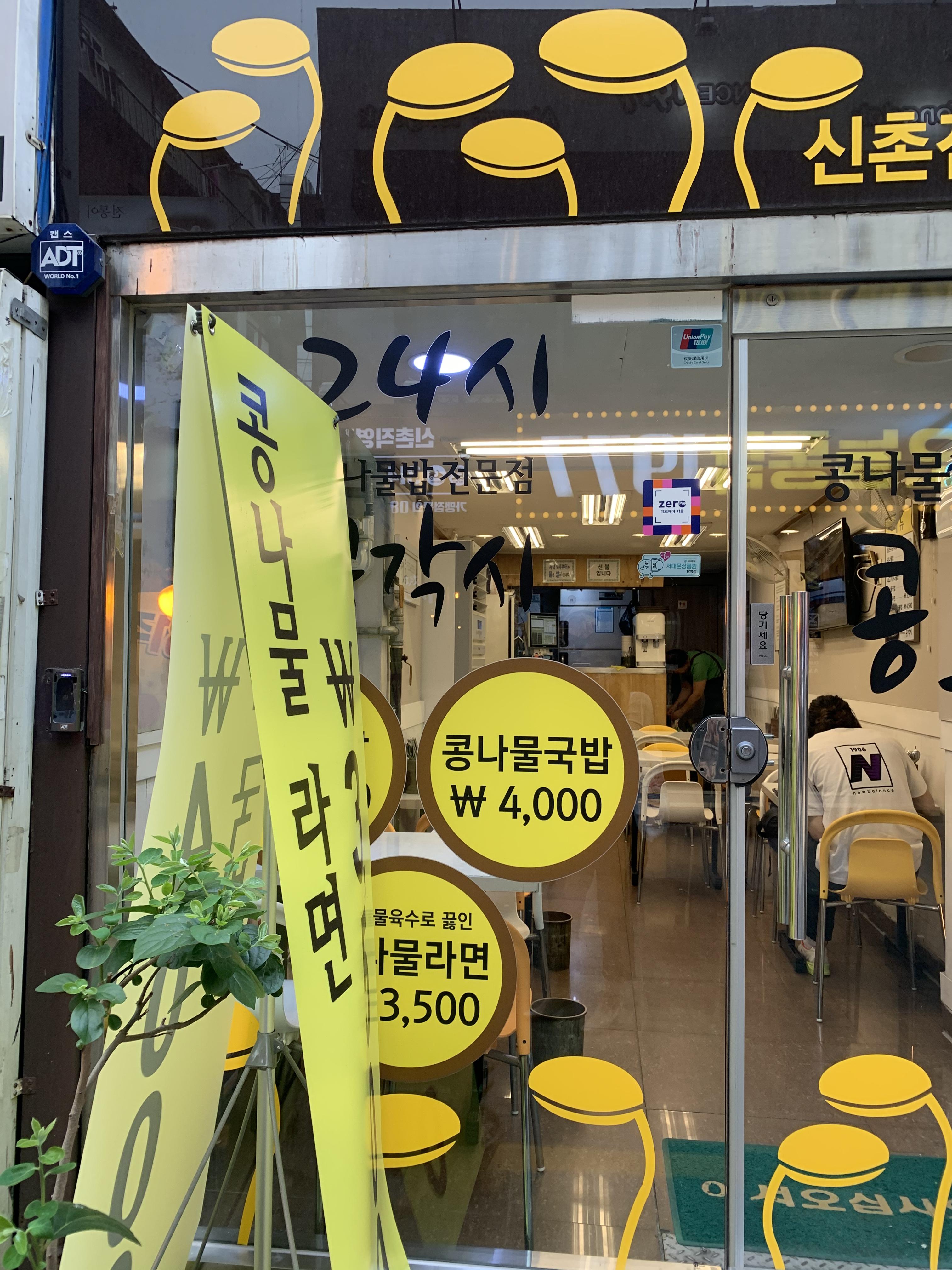 콩각시 신촌점 위치는 연세로에서 하나 옆골목에 위치. 술집이 밀집한 지역 옆에 있고 24시간 영업이라고 하니 대학가에서 밤새 놀 경우 첫차 기다리며 해장하러 많이들 찾을 집이란 생각이 든다.