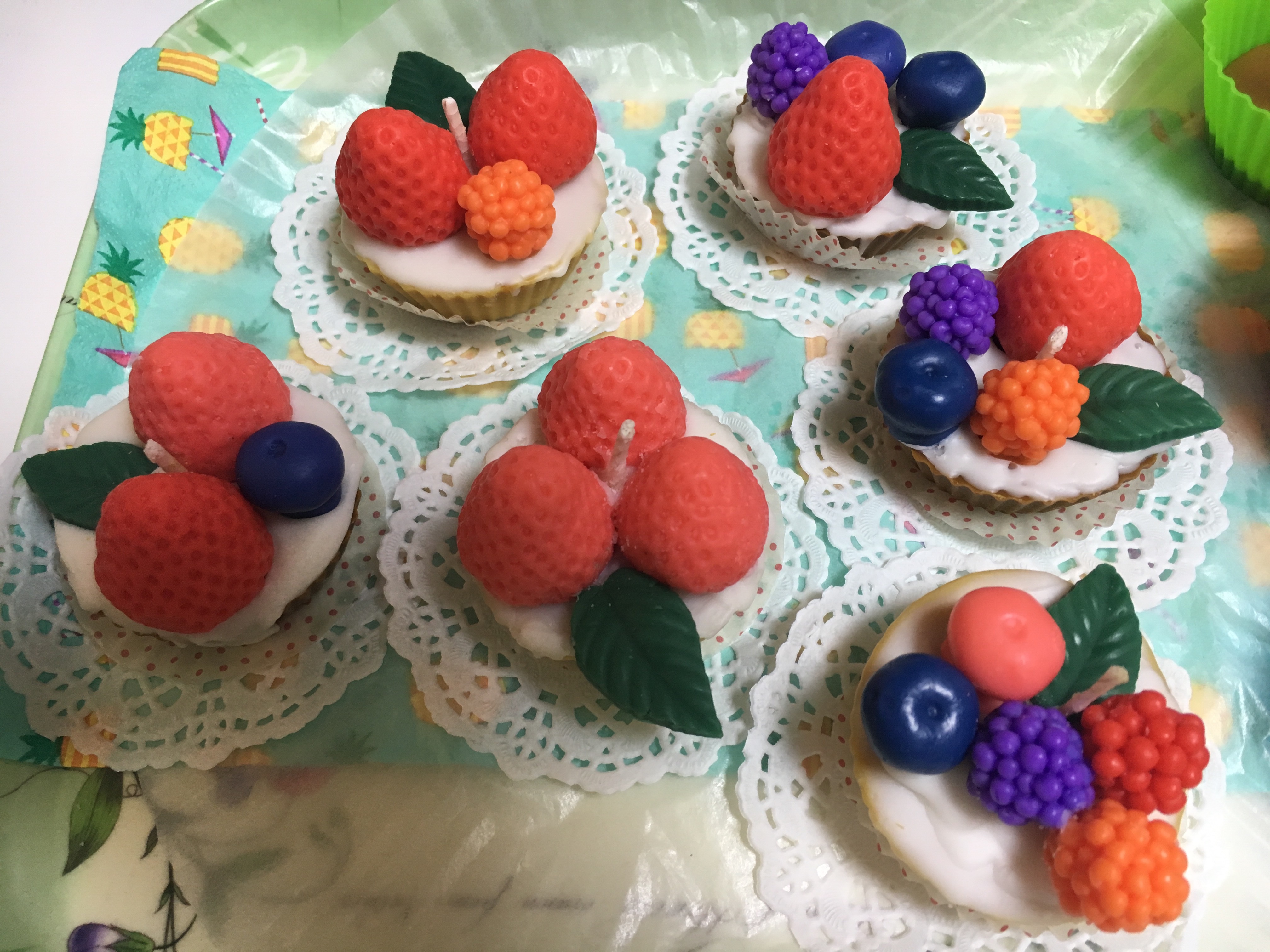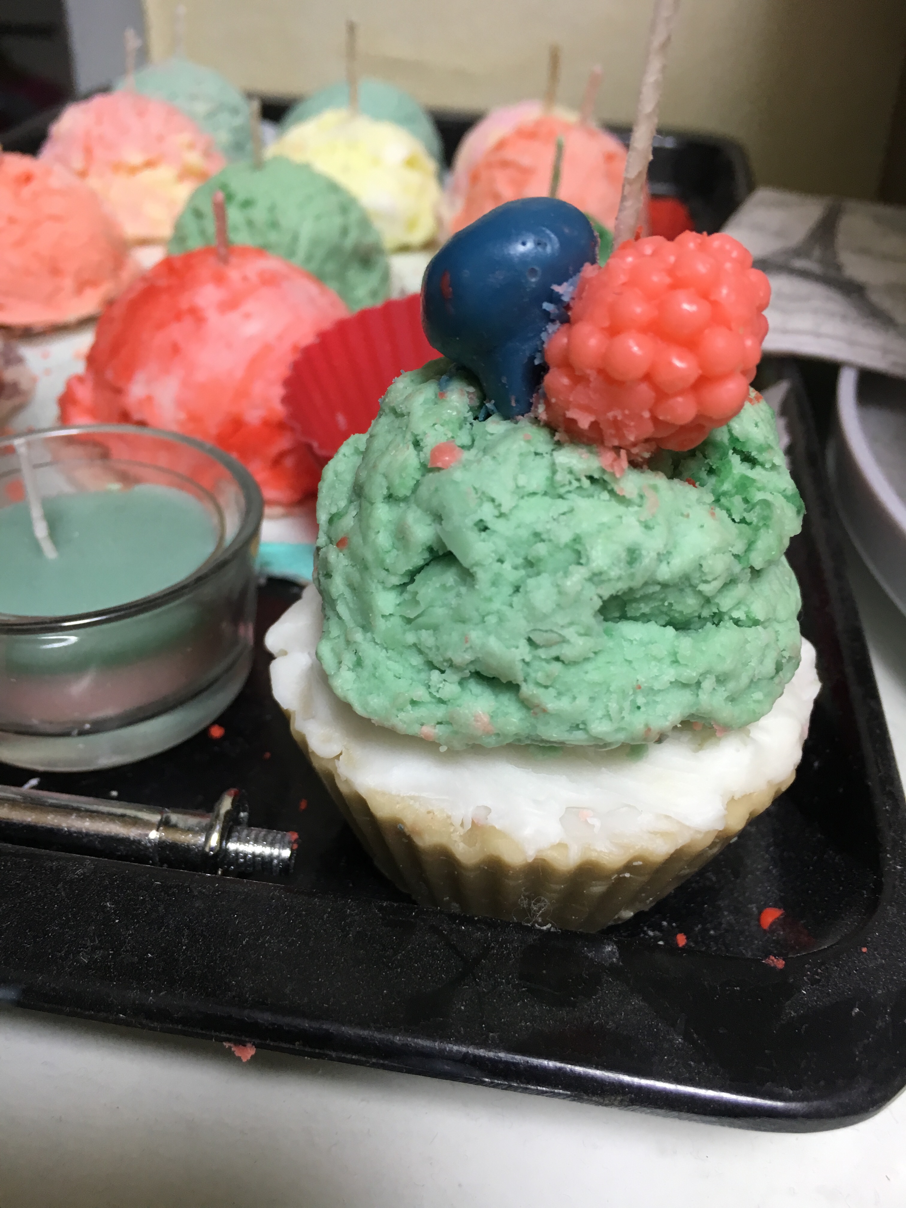 5. 디저트의 빵 부분은 머핀몰드에 왁스를 넣어서 굳히되, 심지가 될 자리를 이쑤시개를 꽂아 미리 만든다.
